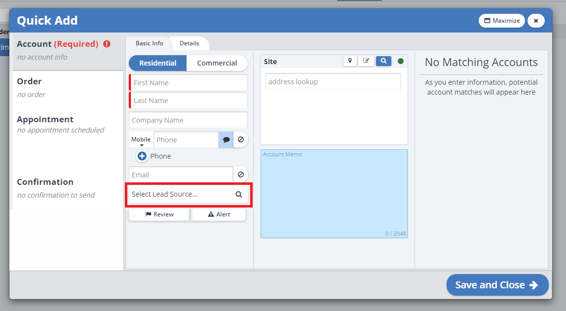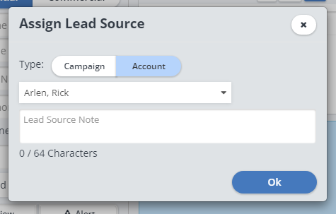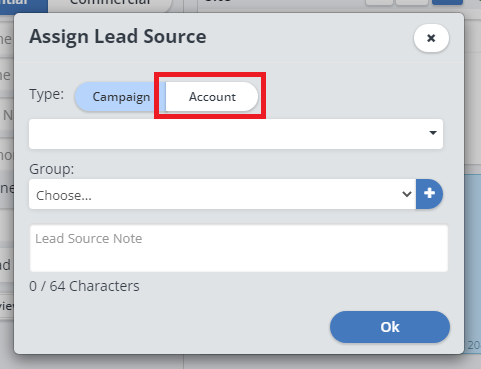When creating a new account in the system, click on the magnifying glass icon next to where it says “Select Lead Source”.