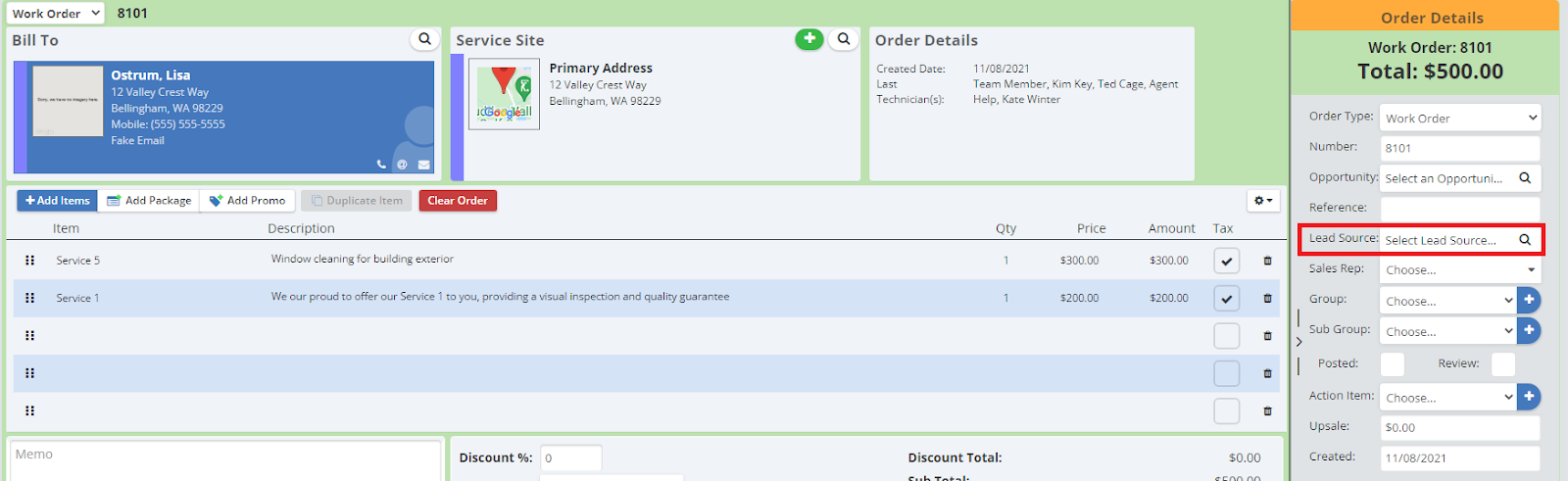 From an order, you can also select an account as the lead source, which will also add it to the “Referrals” page.