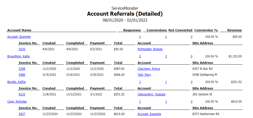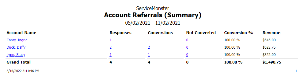 You can use the report Account Referrals (Detailed) to view a list of all account referrals during a time period, including account and invoice information, as well as the number of conversions for that account.