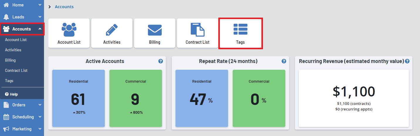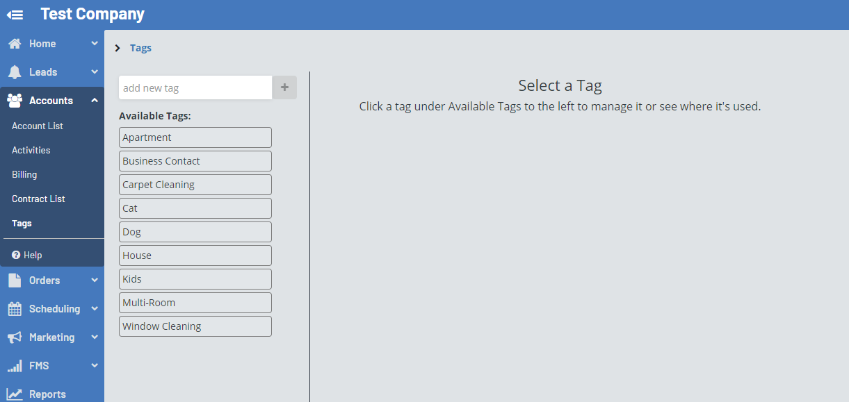 Here you can view all tags and create new tags. To see what accounts have a tag, click on that tag underneath the “Available Tags” label.