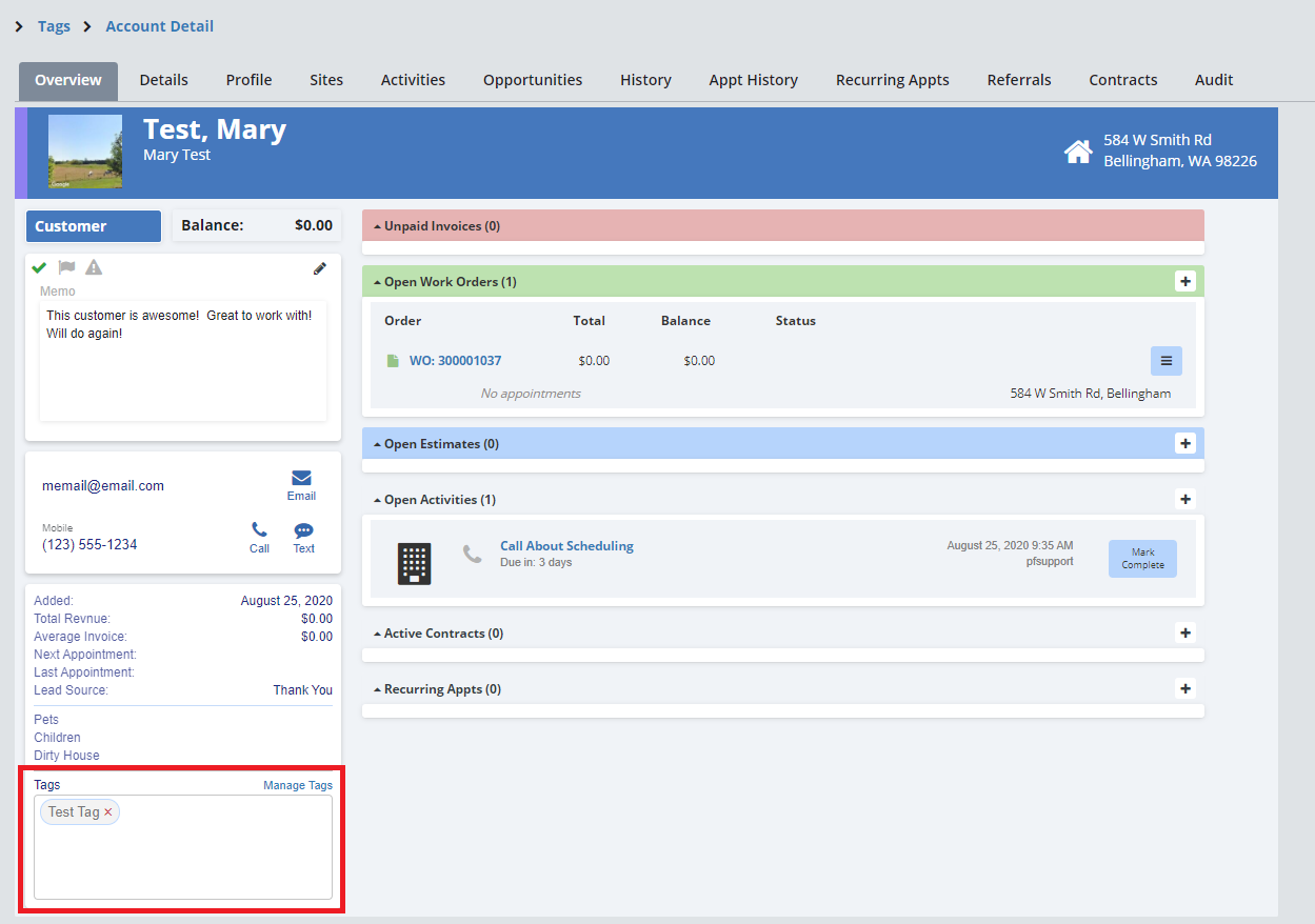 To add a tag to an account, go to the Account - Overview or Account - Details page for the account you wish to add the tag. On the lower left-hand side of the screen, there is a box dedicated to account tags.