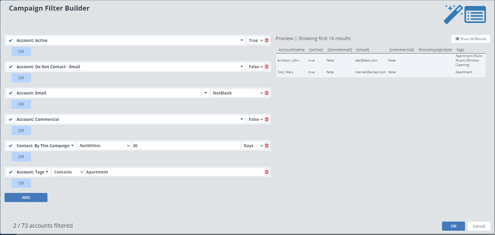 Not Contains: Enter in a tag in the text box, any accounts that do not have this tag are included in the marketing campaign.