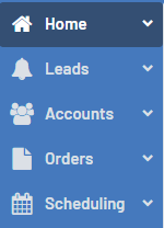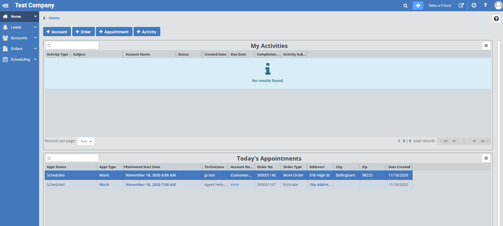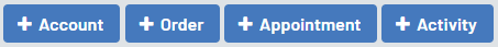 Clicking on the +Account, +Order, +Appointment, and +Activity buttons allow you to quickly create a new account, order, appointment, or Activity.