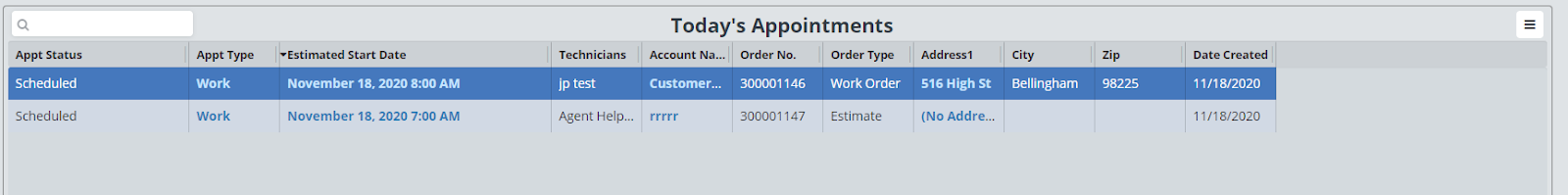 Here you can view the appointments assigned to this user for the day. This is broken down by Appt Status, Appt Type, Estimated Start Date, Technicians, Account Name, Order No., Order Type, Address1, City, Zip, and Date Created. You can also open up the appointment information, account, or site address.