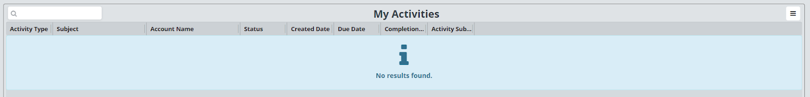 Here you can view your activities assigned to this user. These are broken down by activity type, subject, account name, status, created date, due date, completion, and activity subject.