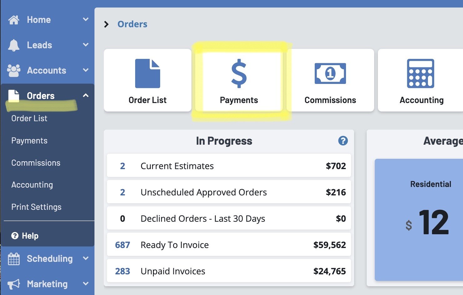 You can see all your past payments and record new payments from the Payments Page. Access this by clicking on “Orders” in the Main Menu, then select “Payments”.