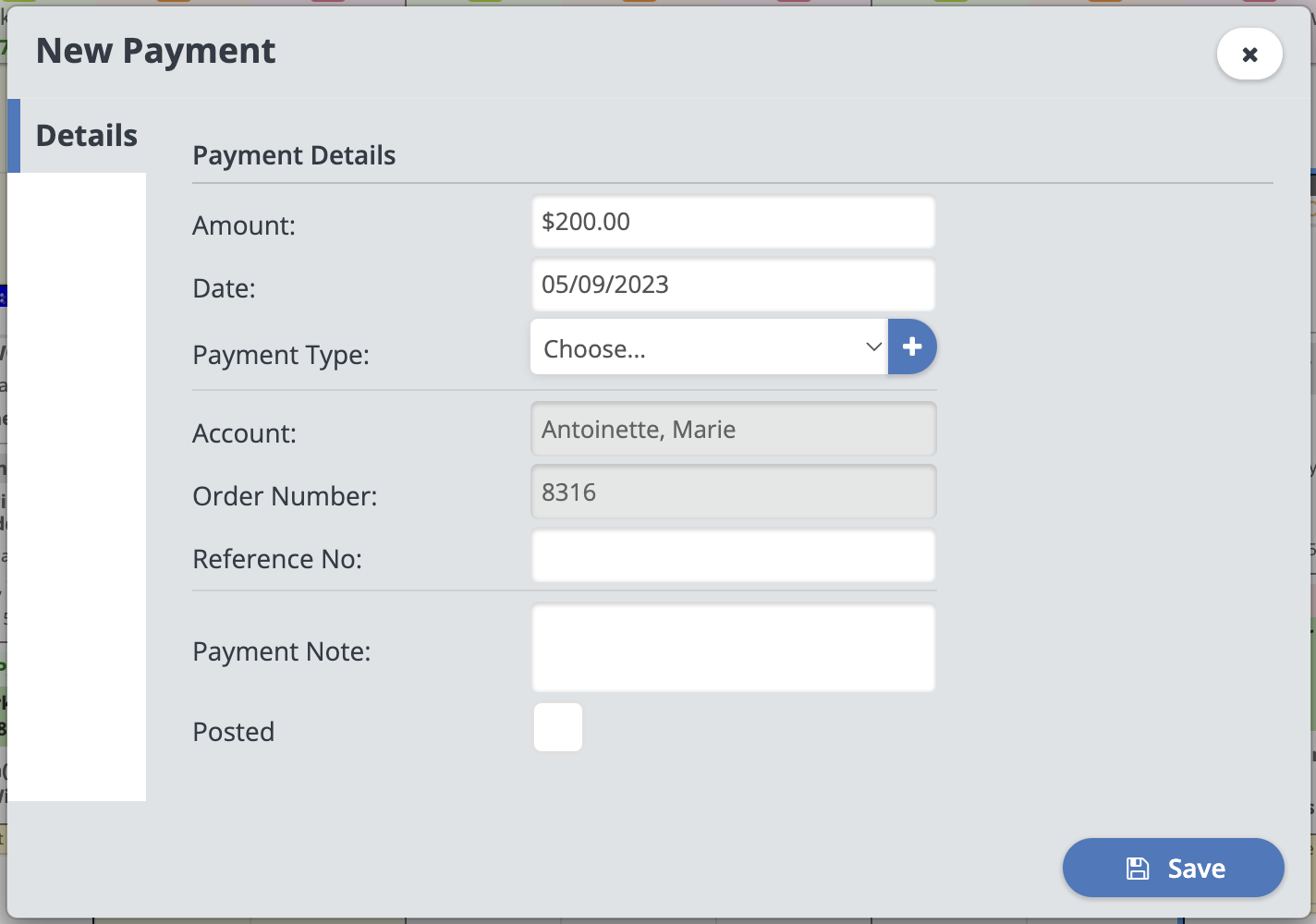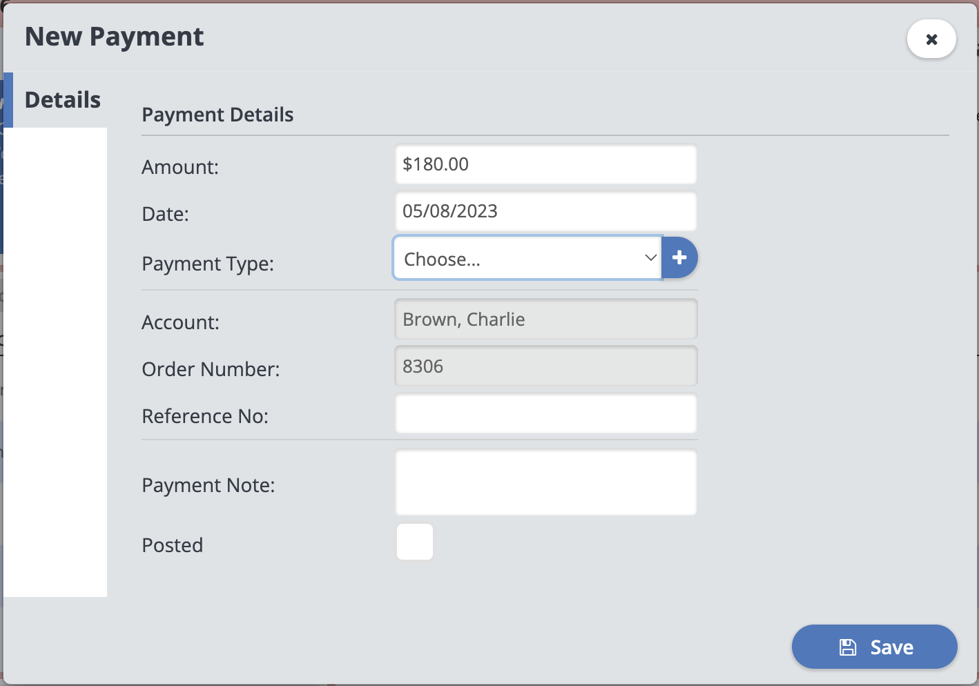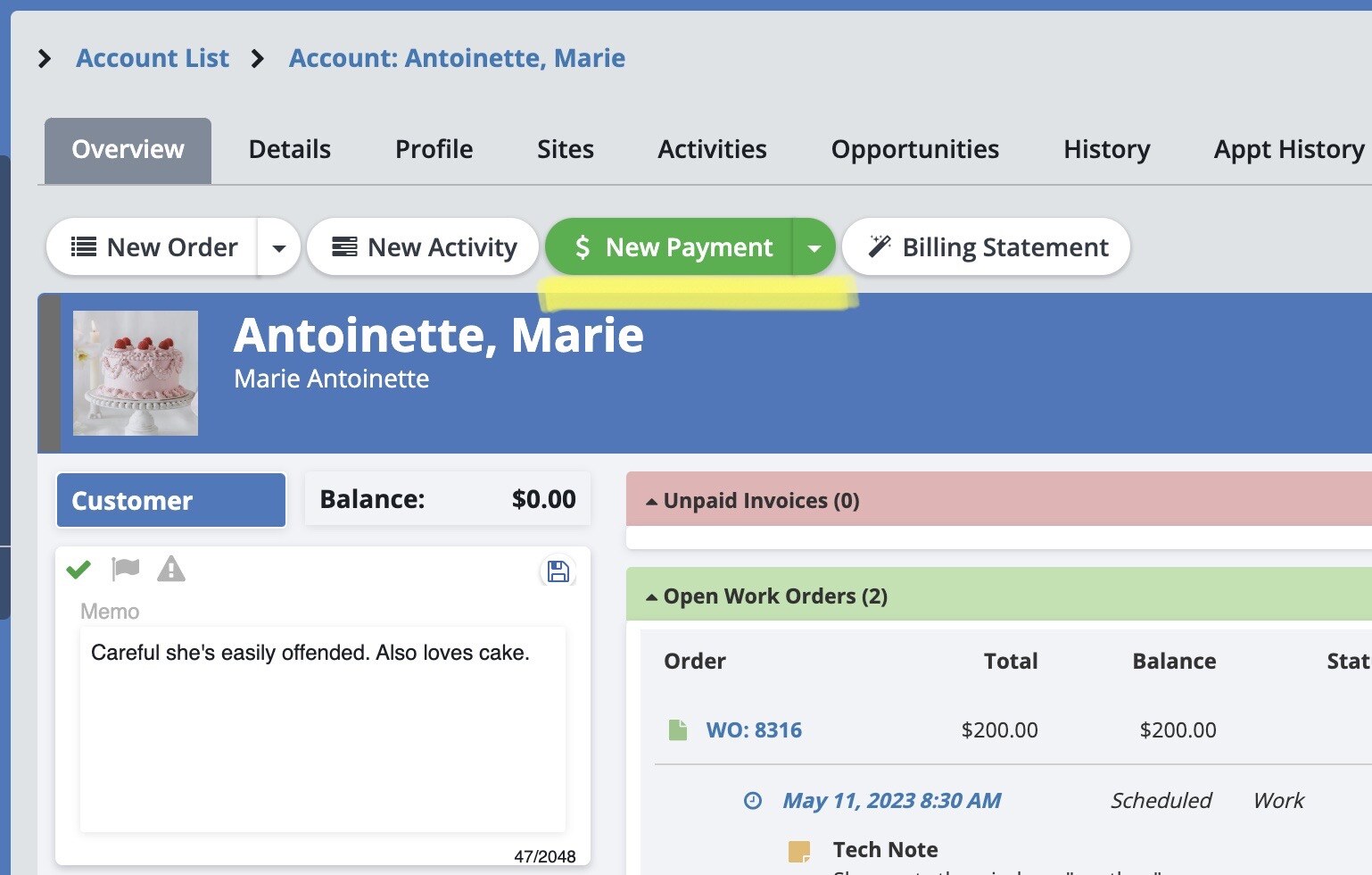 You can record payments for any orders on an account by clicking on the “$ New Payment” button on an account page.
