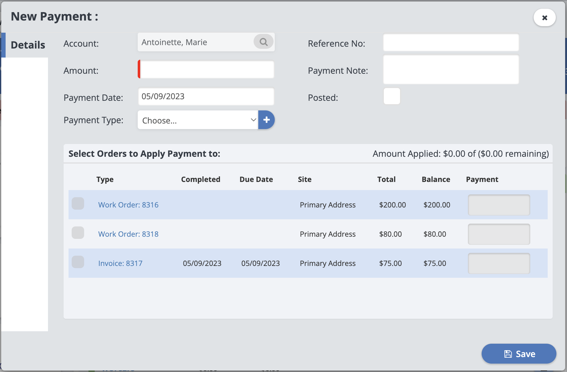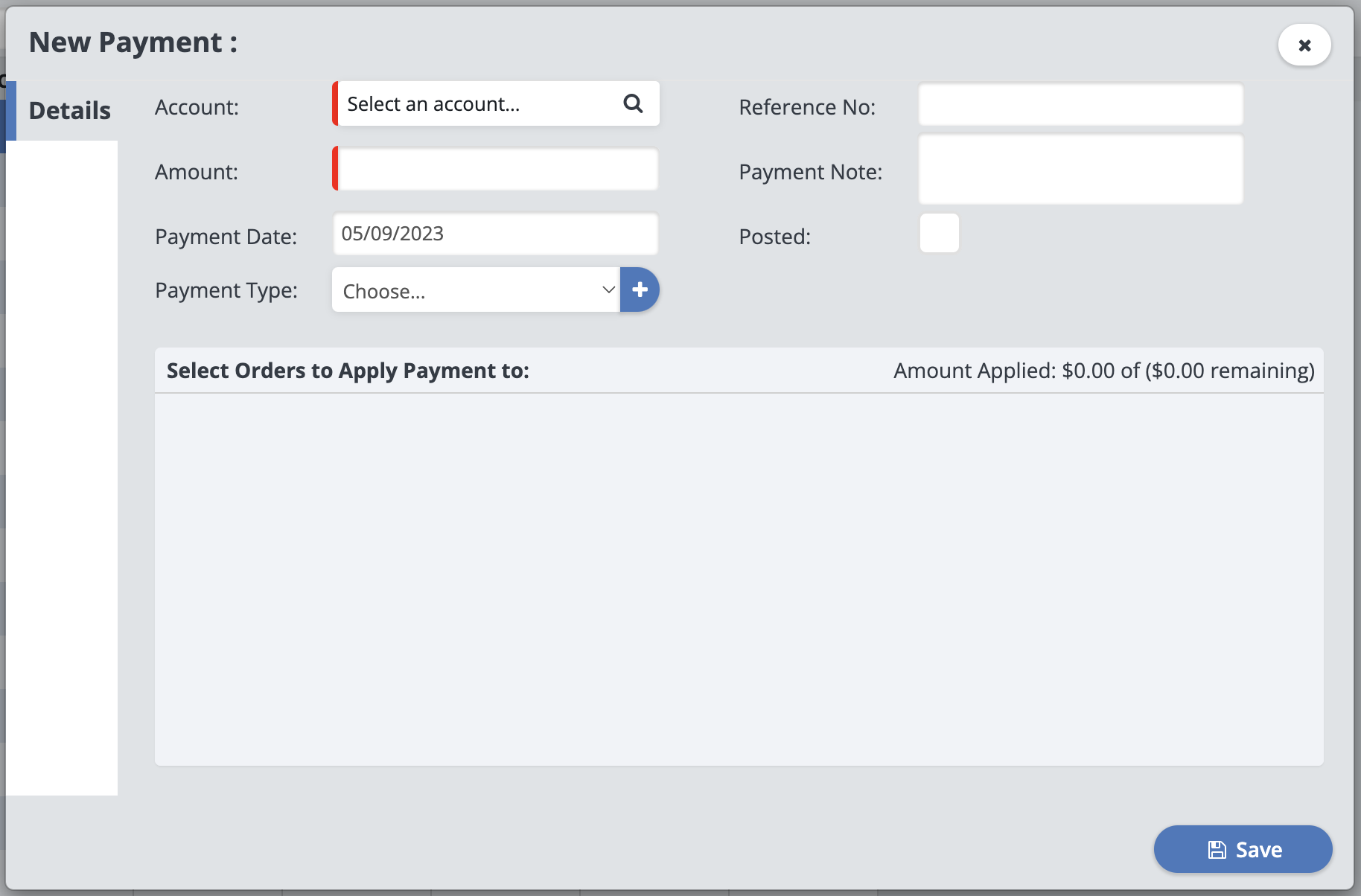 Here you can pick an account, add in the payment details, and choose what orders that payment should apply to.
