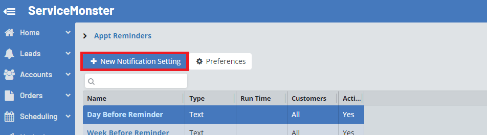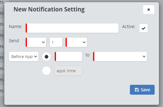 Here you can create new Appointment Reminders, or view your current reminders. Click “+ New Notification Settings” to create a new reminder.