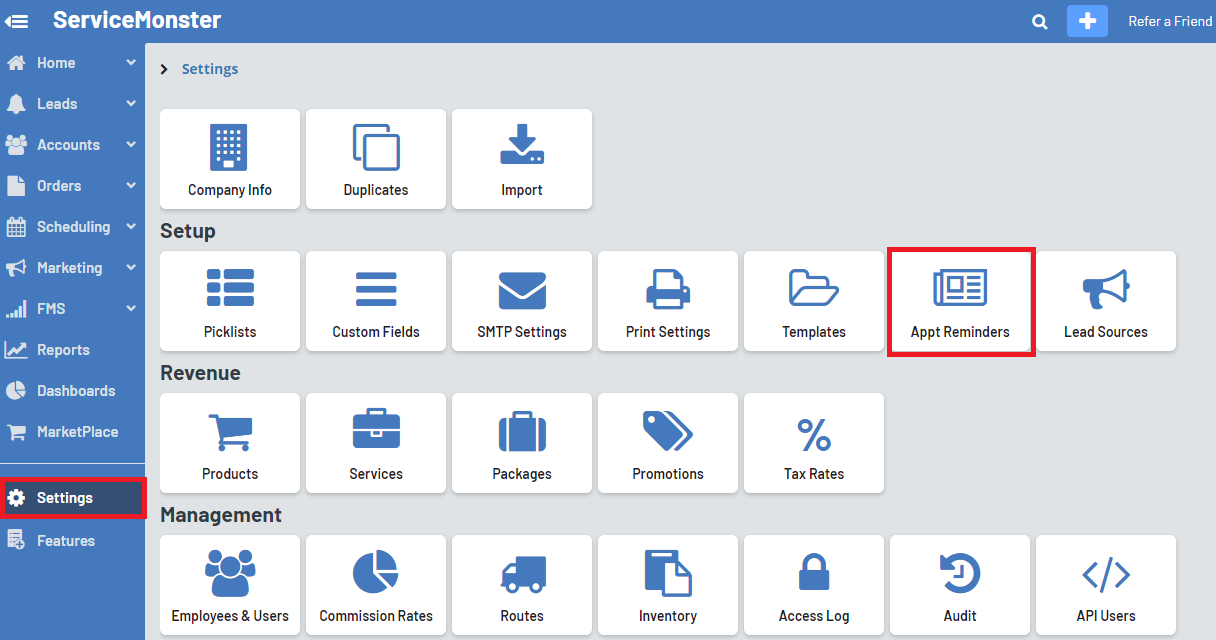 To create the Appointment Reminder, click on "Settings" in the Main Menu, then select “Appt Reminders”.