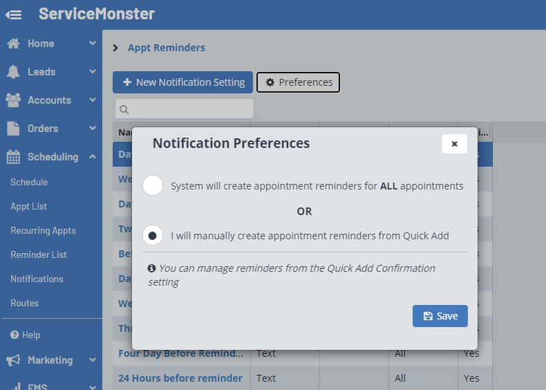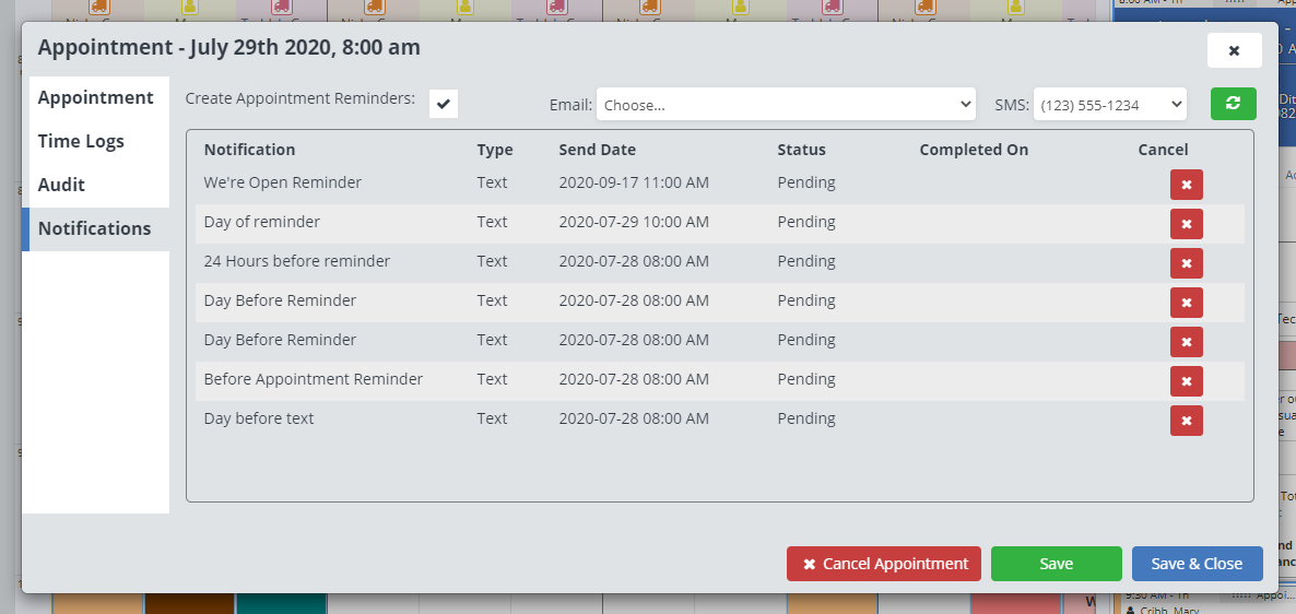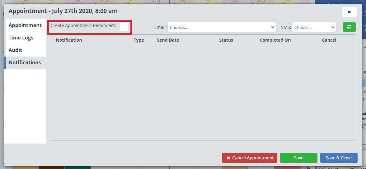 Manually Assigning Appointment RemindersIf you choose to manually create appointment reminders, or if you have an appointment that was created before the notification and you want to edit the reminders it will receive, you can do so from the Quick Add, or from the Schedule.