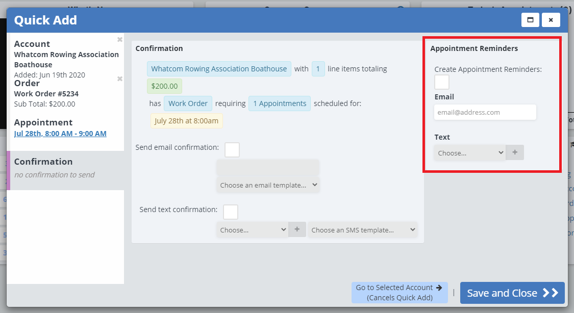 If you created your appointment in the Quick Add, you can turn on Appointment Reminders in the “Confirmation” tab.