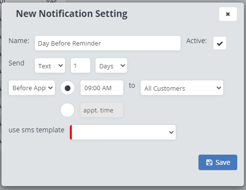 To create an Appointment Reminder, you will first need to create an SMS or Email template, which will be the text, or email that is sent to the client.
