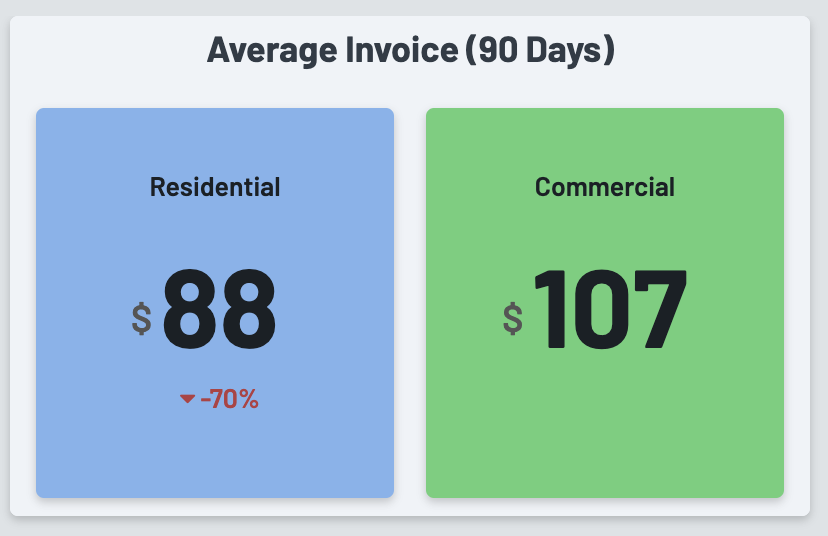 Shows the average invoice total, broken down by residential and commercial customers, over a rolling 90 day period