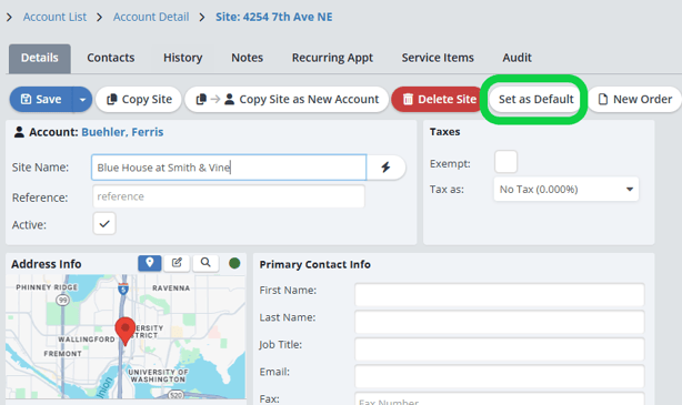 The page will update. Near the top of the page, there will be a “Set as Default” button, click on it. If you entered an optional Site Name as shown below, it will be overwritten with "Primary Address"