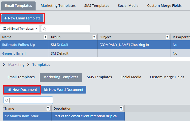 Now go back to the templates page. If you want to create a new email template, click on the “+ New Email Template” button on the Email Templates tab. If you want to create a new marketing template, click on the “New Document” button on the Marketing Templates tab.