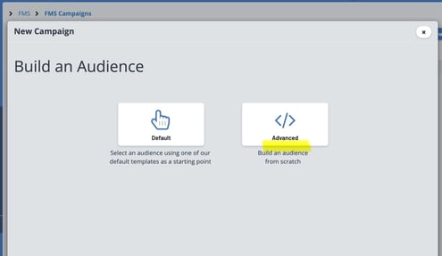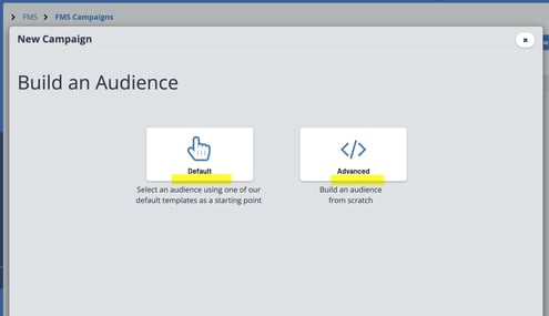 From here, you can choose to build a new campaign with help from our system by selecting the "Default" button, or build a new campaign on your own from scratch by selecting the "Advanced" button.