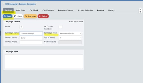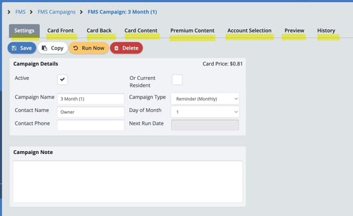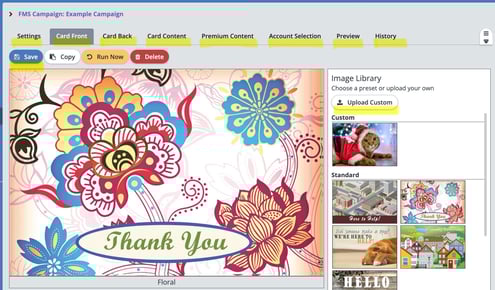This is your Campaign Details screen where you can customize your new campaign. Go through all 8 tabs to make your card customization selections.