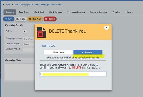 Next, confirm in the new window that you really want to delete the campaign by selecting the "Delete" button and typing in the name of the campaign.