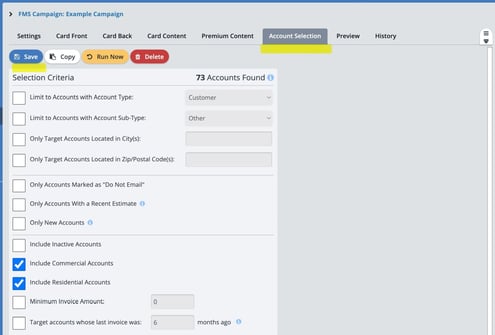 From the "Account Selection" tab, toggle on or off the filters you wish to use to reach your desired audience. Please select "Save" when you are finished.