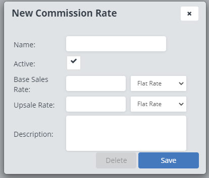 Base Sales Rate: Here you can choose what your commission on base sales will be. This can be a flat rate or a percentage, you can change between the two options by using the drop down menu. You can leave this blank if you don't want a base sales rate to be included on this commission.