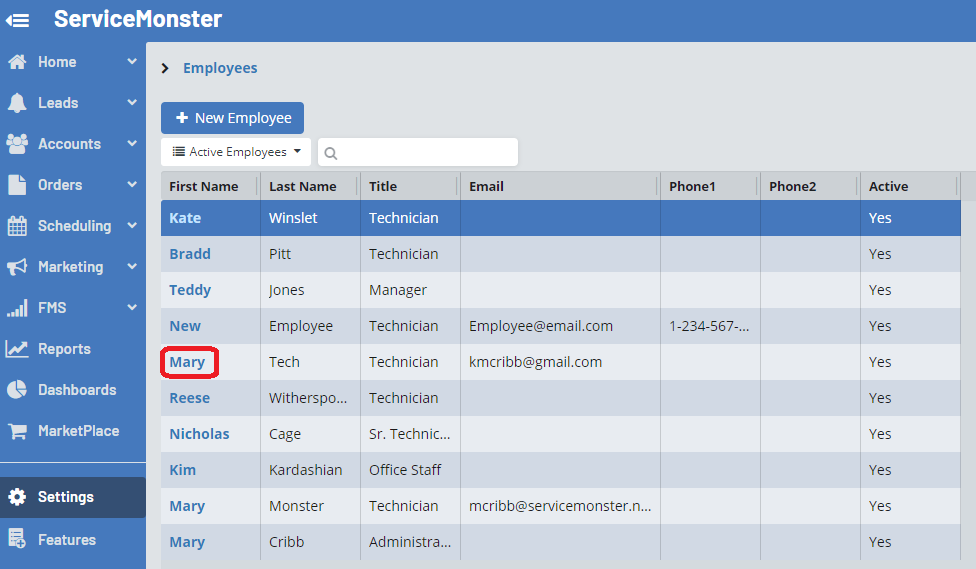 From the Employees & Users page, click on the name of an employee you would like to assign the commission to. To learn how to create a new Employee or User, click here.