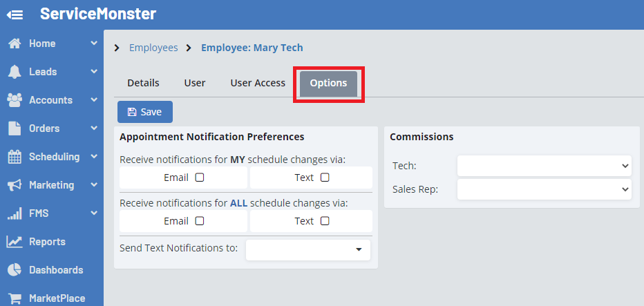 On this page, in the commissions box, you can choose the commission that will be applied if that employee is assigned as a Tech on an appointment, or as the Sales Rep on an order.