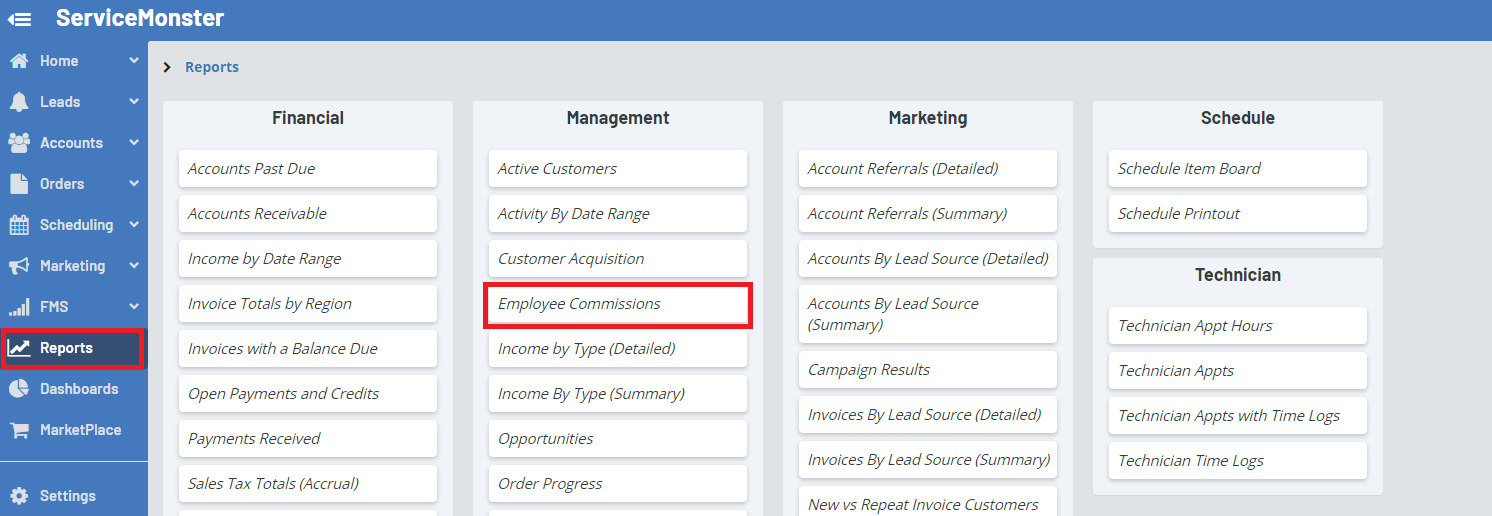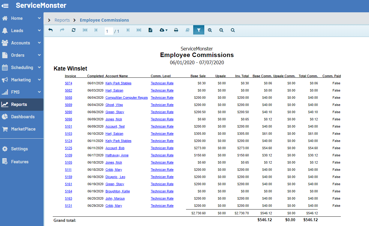 This report will allow you to see a list of invoices with their commission information. You can also filter this list by a time range, by if the commissions are paid, and by employee.