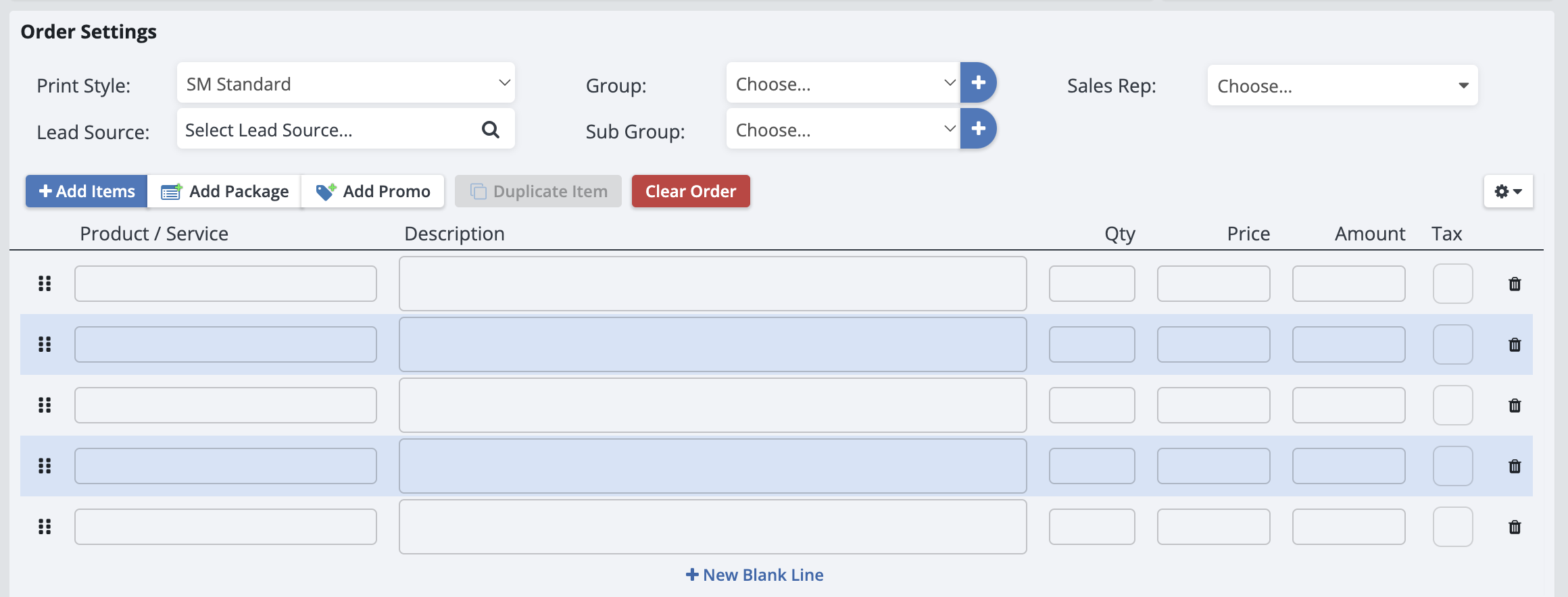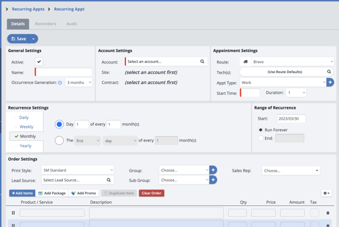Here you can enter in your order settings and the line items for this order (the products and services you are offering for this recurring appointment).