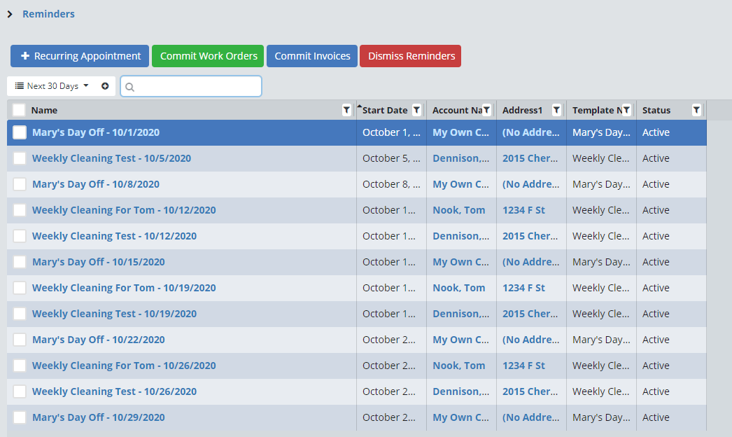 Recurring Appointments create Appointment Reminders on the schedule. These block out time like regular appointments, but don’t yet have a Work Order attached to them. This way, if you have recurring appointments that are spaced out over a long period of time, you can check in with the client to confirm the appointment before creating a work order in the system for it.