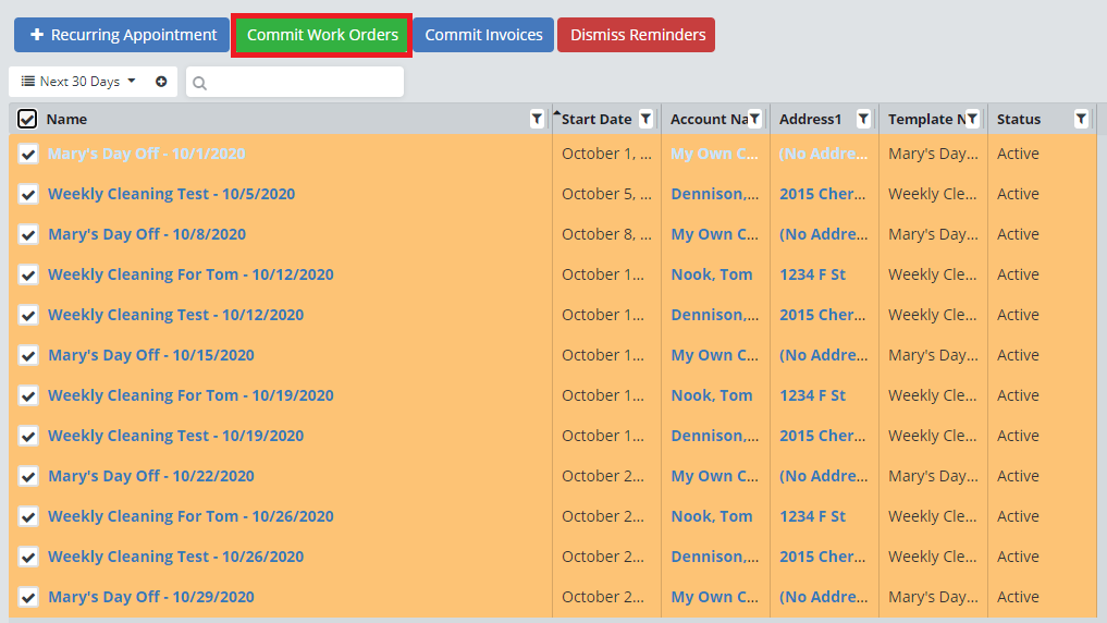 You can then convert them by clicking on the “Commit Work Orders” button to turn them from Appointment Reminders into regular Appointments, and to create Work Orders for them. You also have the option to commit them to Invoices by selecting "Commit Invoices" (just keep in mind that you can no longer edit an Order when it's in the Invoice state).