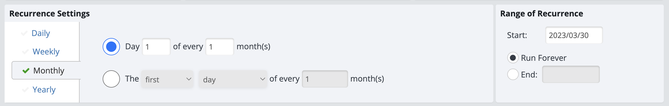 Monthly: With the monthly option, either pick what day of the month and how often it repeats, or select a week day it occurs on and how often.