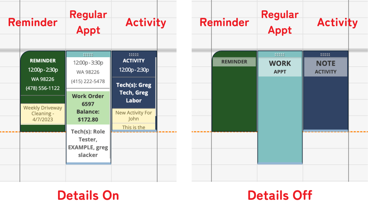 Appt Reminders/Recurring Appts are color-coded green until a Work Order or Invoice is created for it. When this happens it will turn into a regular Appointment Card and the color-coding will change to be based on where that appointment is located (click here to learn more about appointment color coding).