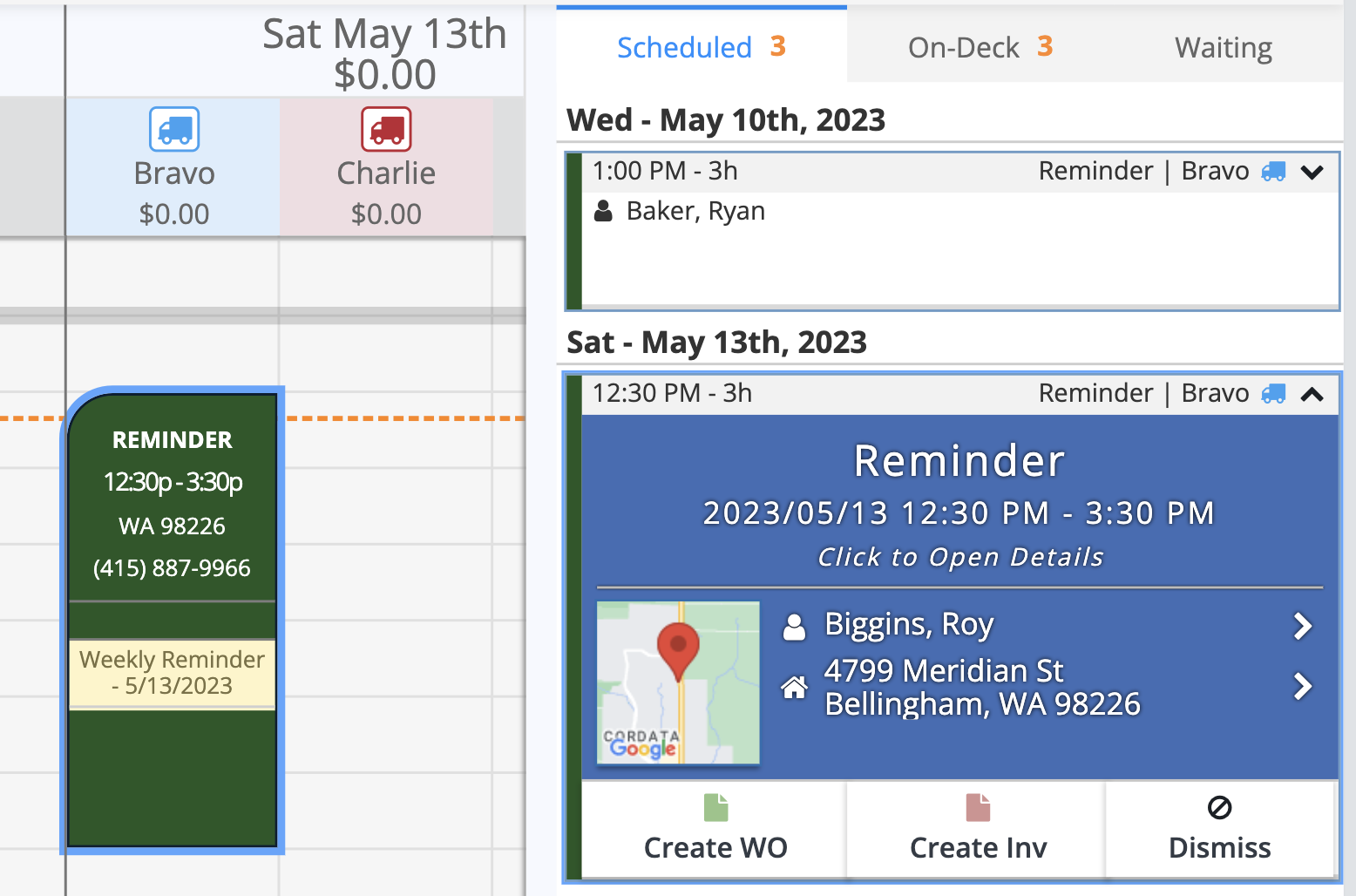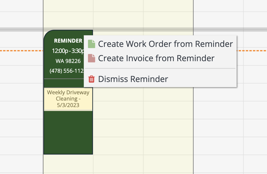 You can do this from the Sidebar or on the Schedule by right clicking on the Appointment Reminder and selecting “Create Work Order from Reminder” or “Create Invoice from Reminder”. You can also remove the reminder from the schedule by clicking “Dismiss Reminder”.