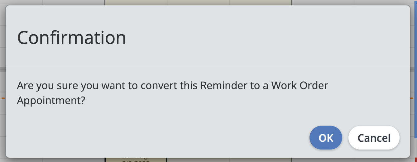 The system will confirm with you before it converts the appointment. Click “Ok” to convert the Reminder to a regular Appointment.