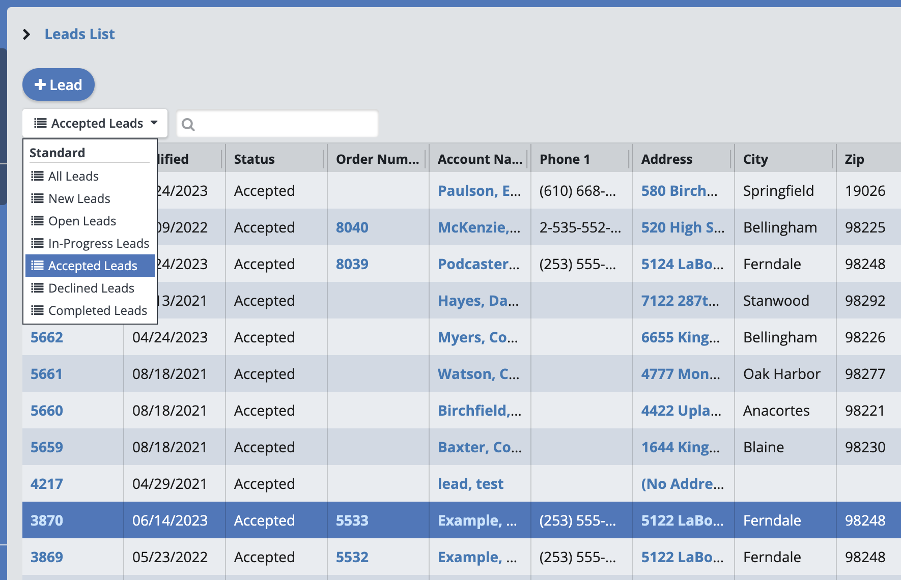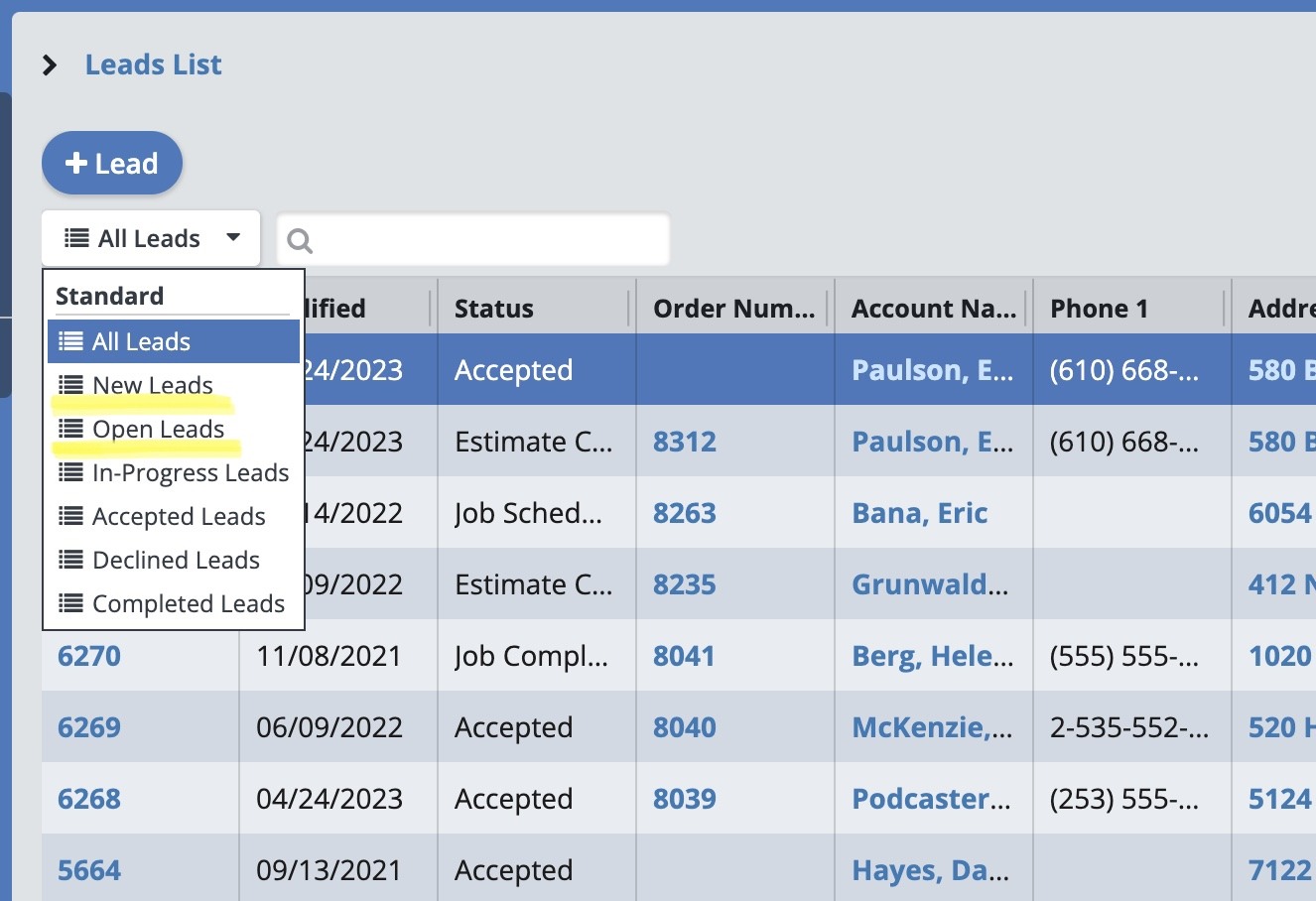 Here you can see your list of leads. You can filter to view “All Leads”, “New Leads”, “Open Leads”, "In-Progress Leads", “Accepted Leads”, “Declined Leads”, or “Completed Leads”.