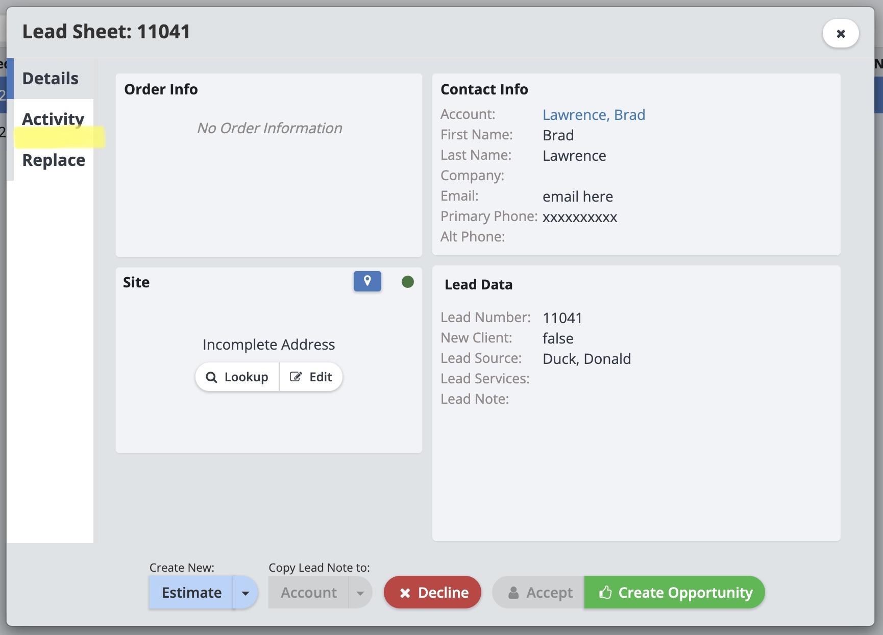 As you communicate with your lead, you can track those conversations through the “Activity” tab. Activities are a great way to record notes from conversations and keep track of notes, calls, mail, or tasks for a specific account or lead.