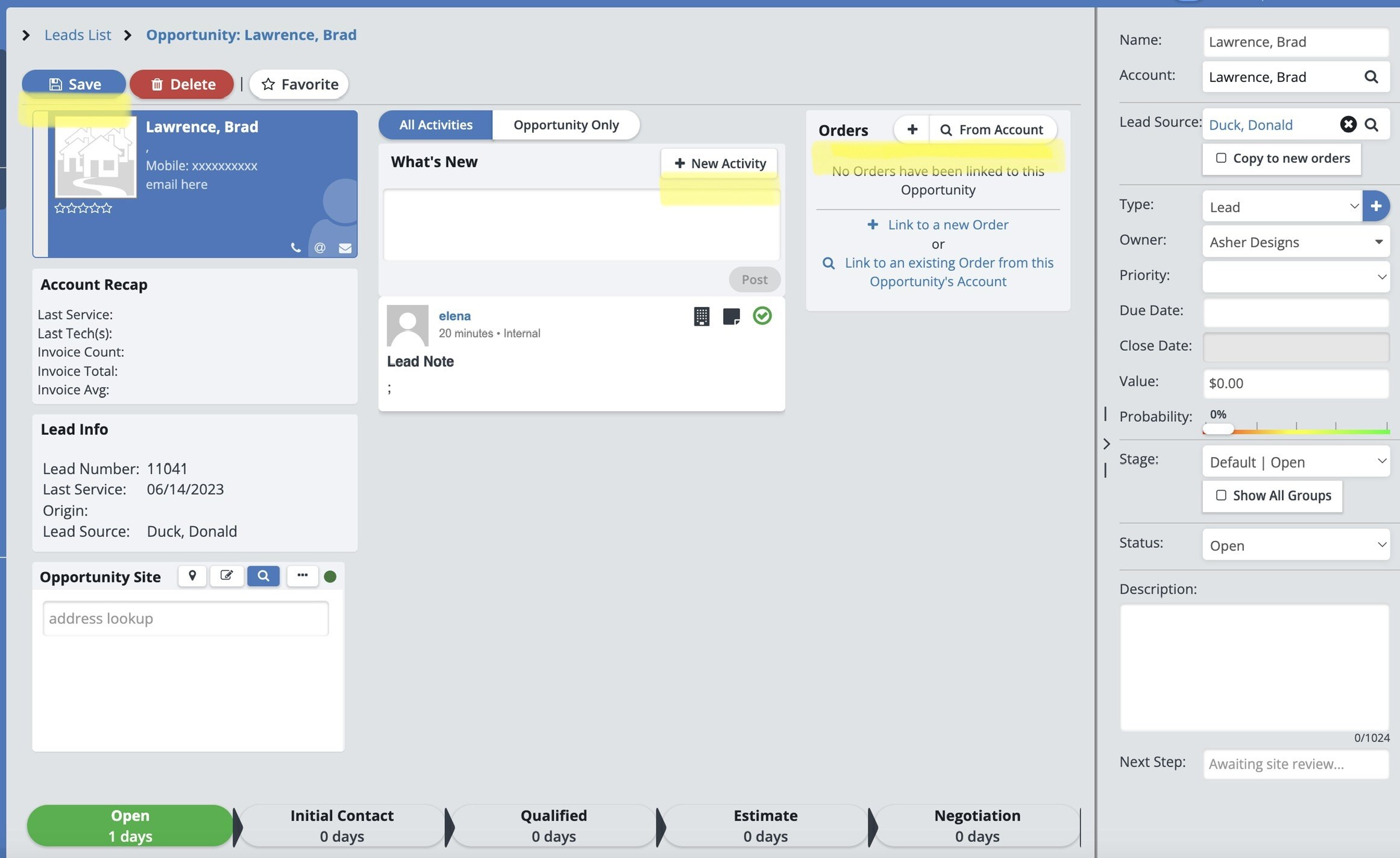 Once approved, the Opportunity Page will open where you can fill in more information, edit, add new activities, or create a new order for the Opportunity (Lead).