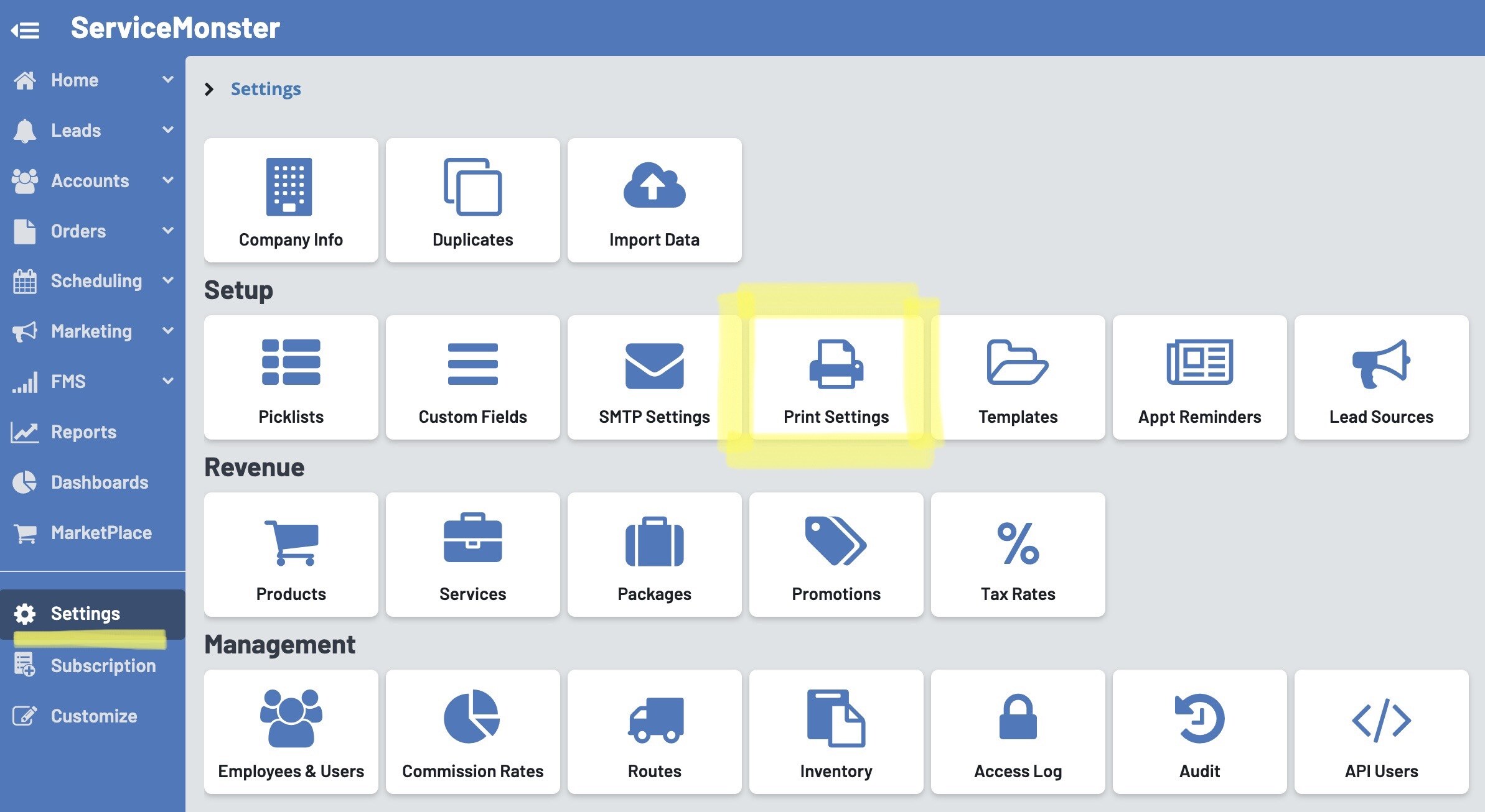 Select “Settings” in the Main Menu, then select the “Print Settings” icon.
