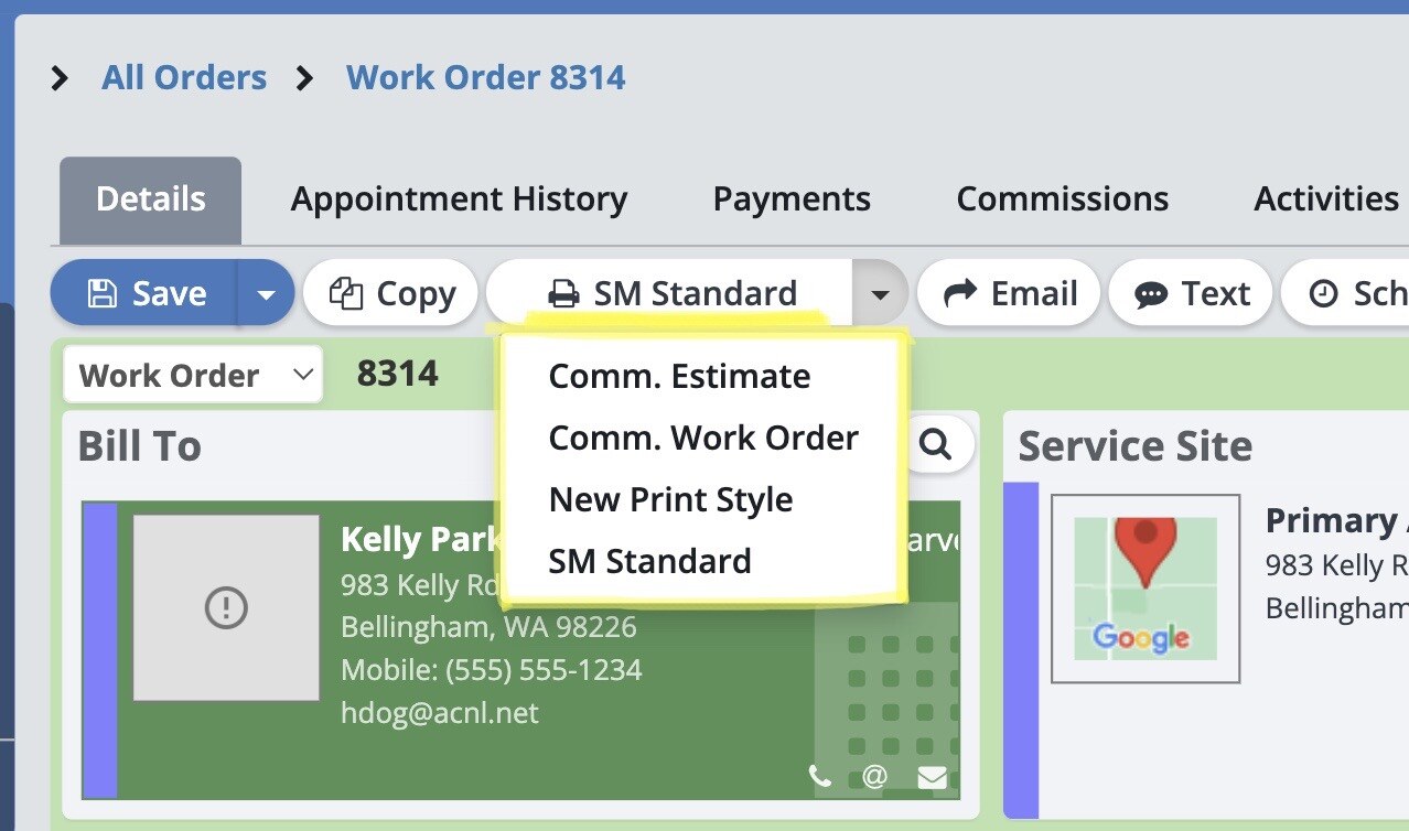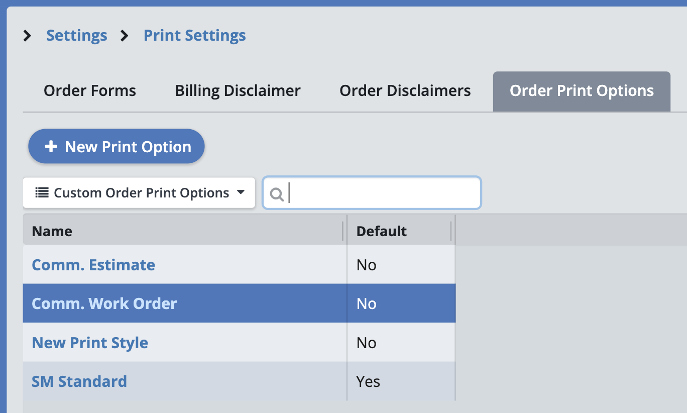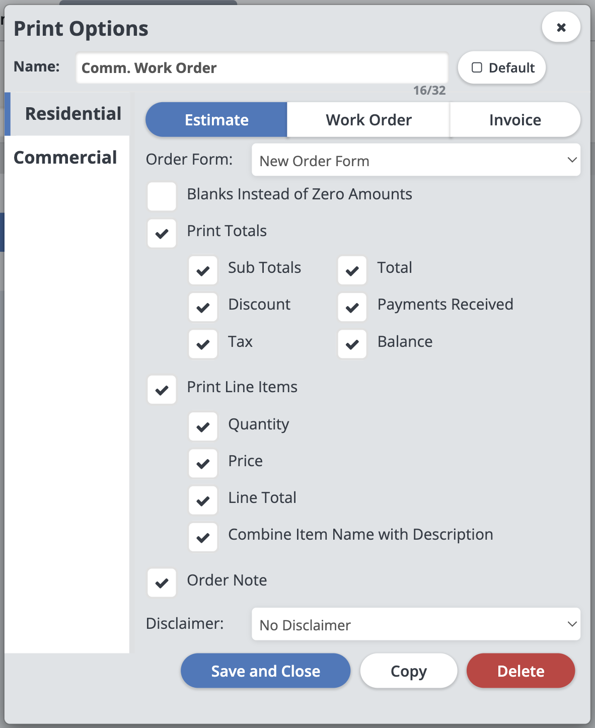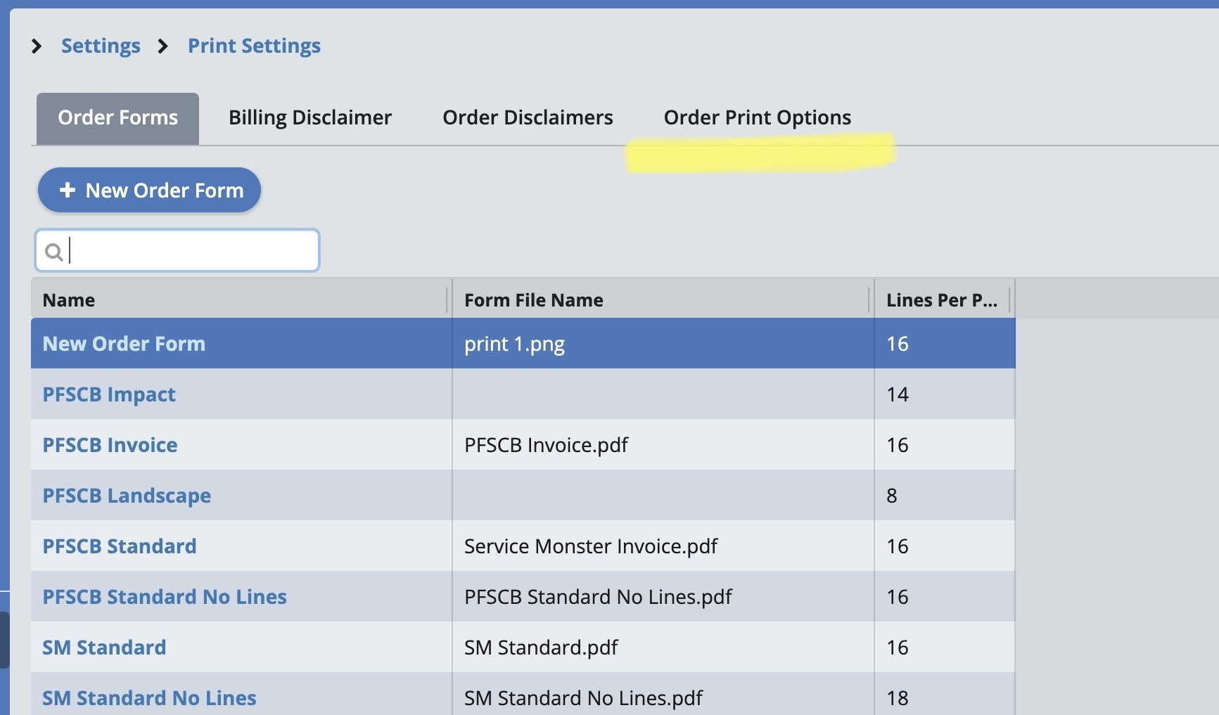 A print option is how you set up your order forms. You can create and adjust print options to apply to different orders. This allows you to make changes such as not show the total due, or change how it’s formatted for residential vs. commercial.