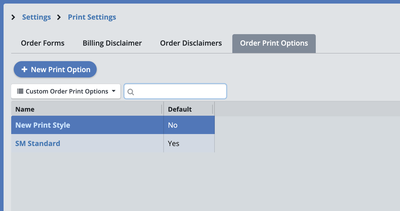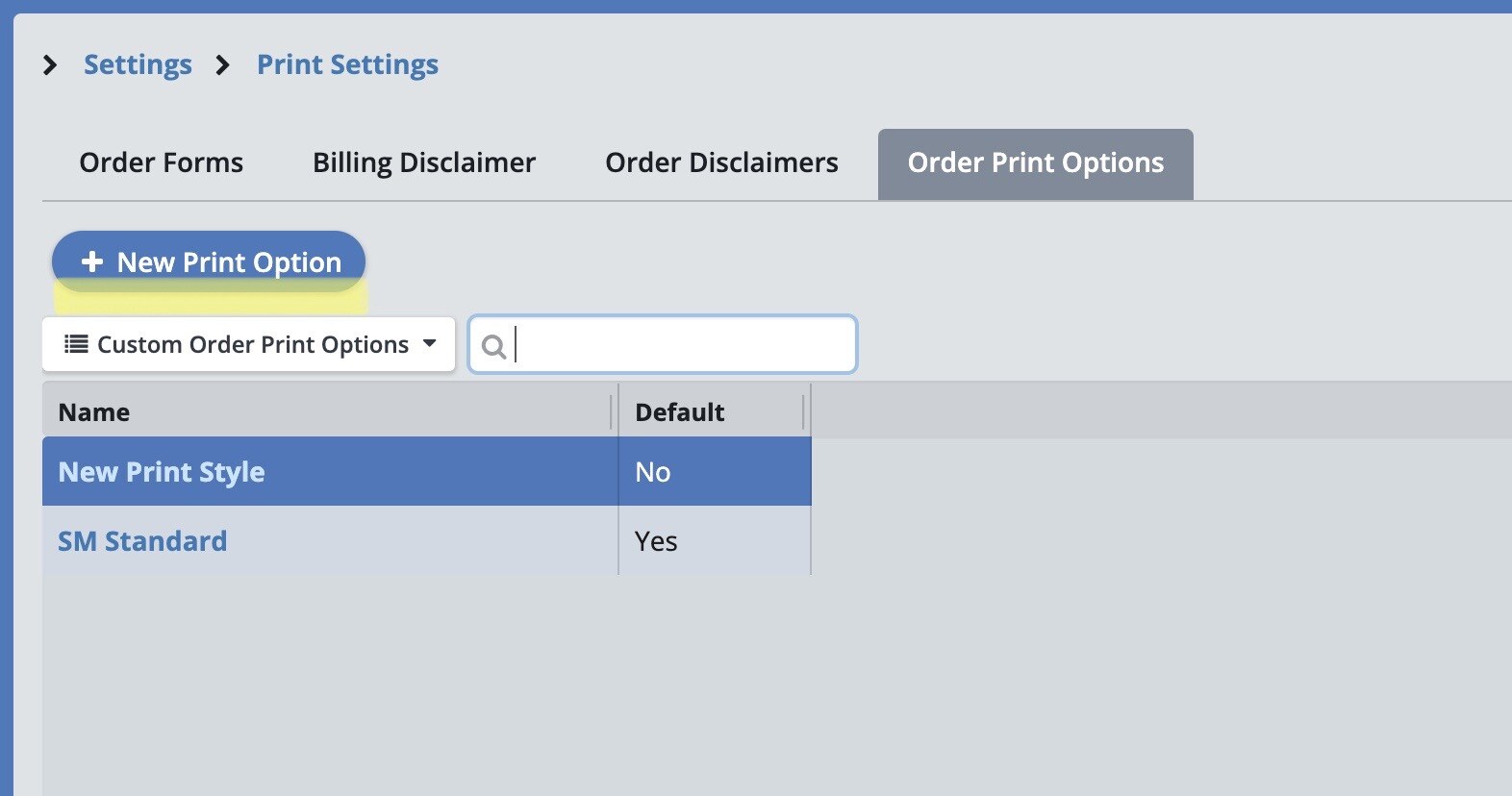 Here you can view all Order Print Options currently created, as well as create new ones.
