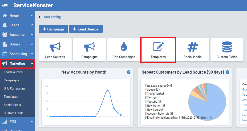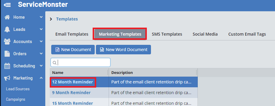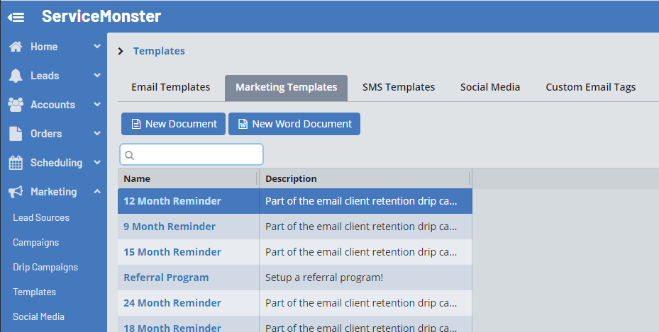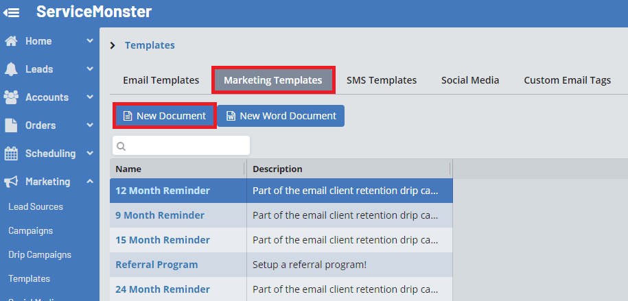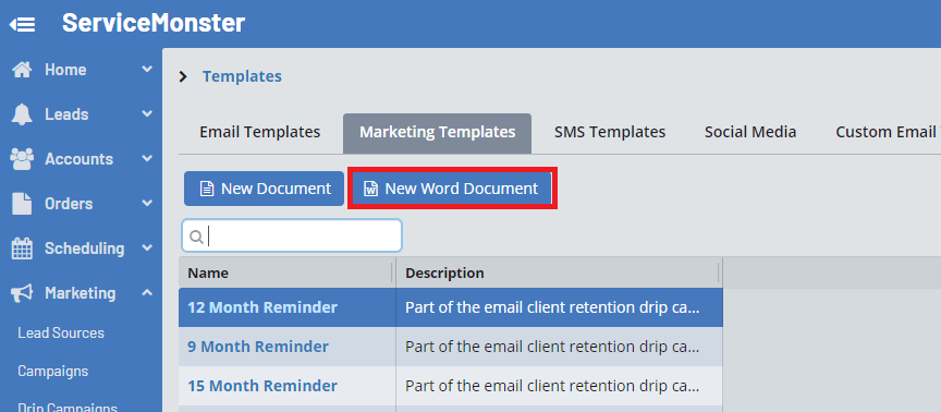 Then, in ServiceMonster, go into your Marketing Templates and click the "New Word Document" button.
