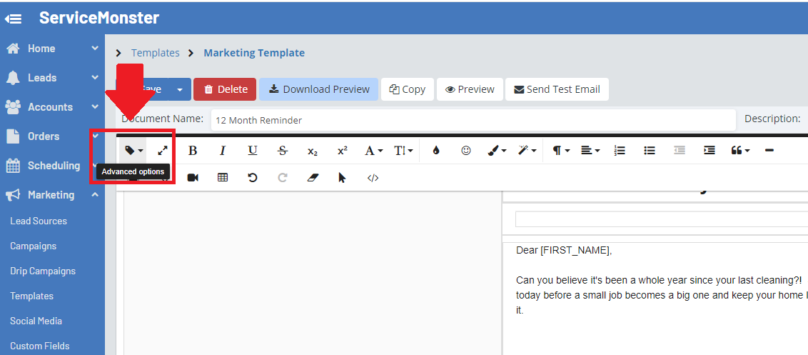 Merge Fields take all of your data that is within ServiceMonster, and pull information out and insert them into the templates for you, personalizing it for each client it’s sent to. You can insert Merge Fields into your templates by clicking on the "Advanced Options" button (Looks like a price tag)