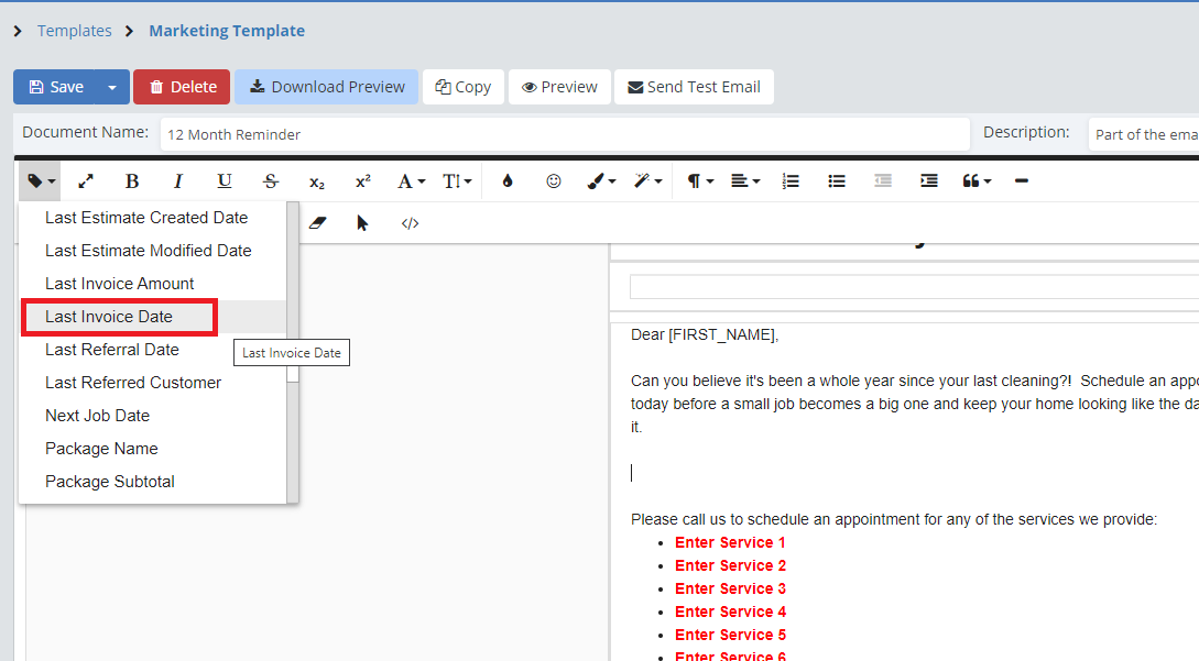 Remember to be creative with your templates! You clients could be receiving weekly emails from other businesses, how will you make yours stand out? Use images, hyperlinks, and merge fields to your advantage to make a personalized and interesting email or letter for your client to receive. Make sure to include the best way for them to contact you in case they do decide it's time to get some work done!