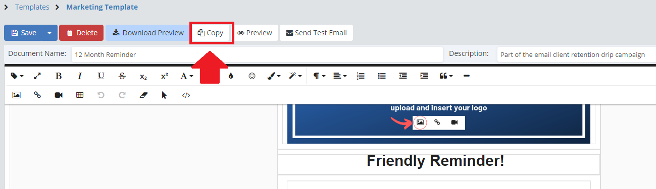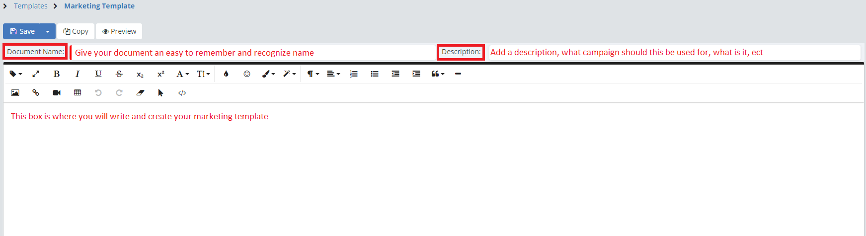 Your last option is to make a Copy of a preexisting template to use as a base for the new template. If you want to make a copy of a template you can edit, simply open up the Marketing Template page, and click on the name of the template you would like to copy.