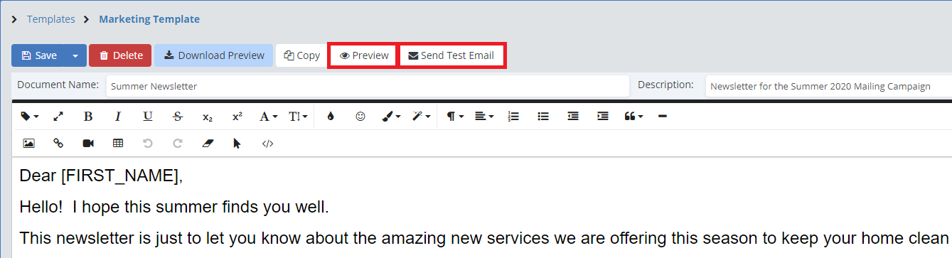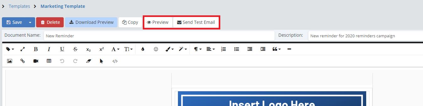 To see how this will look to your clients when they receive it, simply click on the "Preview" button and the preview window will open, or click the "Send Test Email" button to send out a test email to yourself.