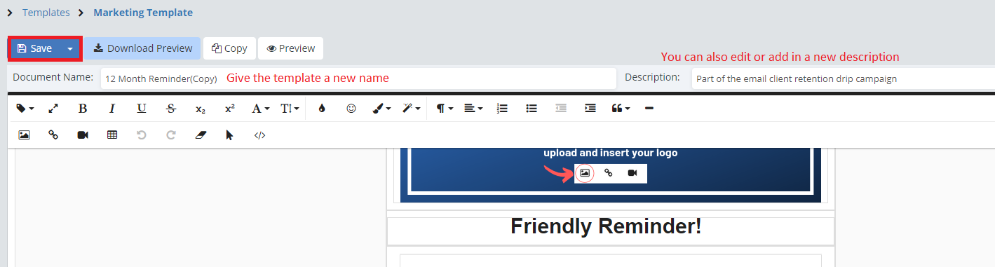 Click "Save" and then on the "Preview" button to see a preview of what the template will look like with the Merge Fields filled in. We also offer merge fields that can easily insert links to your social media into a template. To learn more about how to set these up click here.