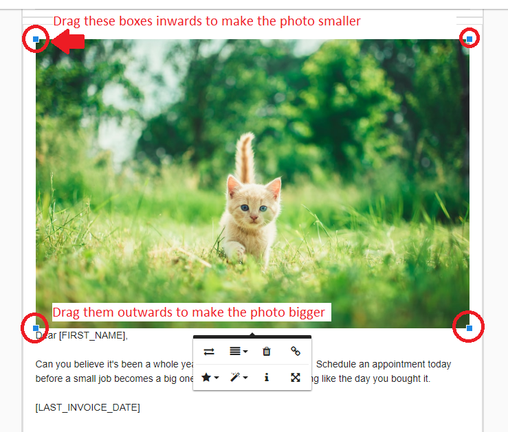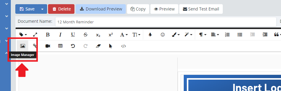 Images are a great way to customize your templates and make them truly unique to your business. They give you an opportunity to let your clients get to know you and your business. Consider adding in a team photo, an adorable pet, or before and after photos of the work you've done. Images can be added in by clicking where in the template you want the picture to go, then clicking on the "Image Manager" button on the toolbar.