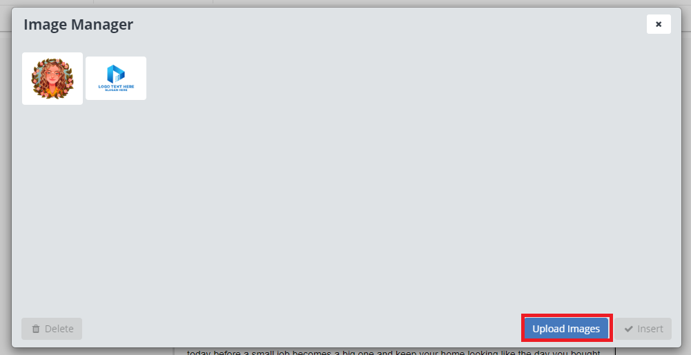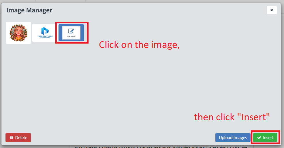 Once your image is uploaded, simply click on it, then click the "Insert" button.