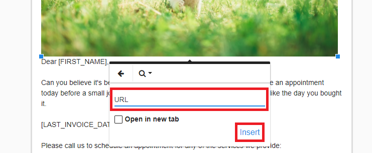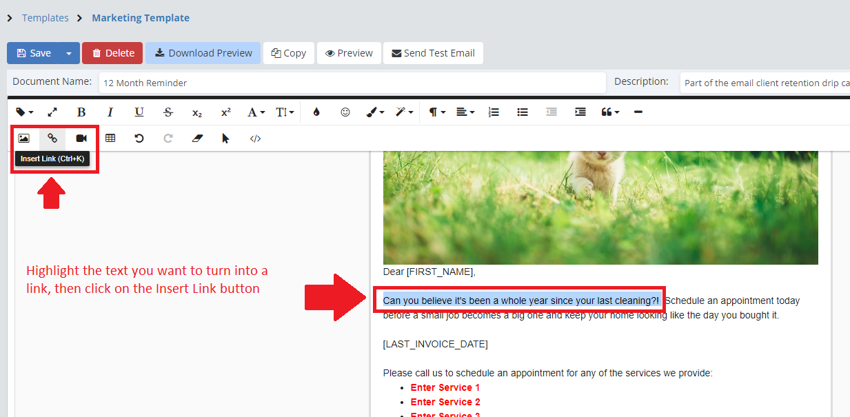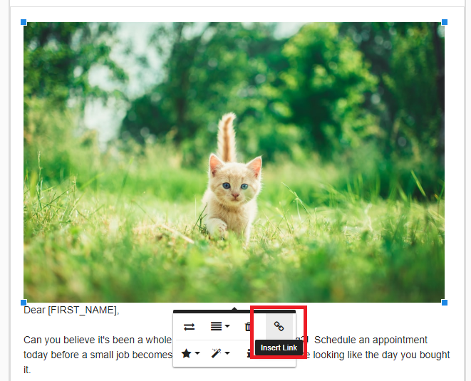 Hyperlinks work in Email Campaigns, and they are a great tool to utilize to get more traffic to your business's website or social media pages by giving your clients a simple link to click on. To add in a hyperlink to text, simply click and drag over what text you want to be a link, then click on the "Insert Link" button (Looks like a chain link)